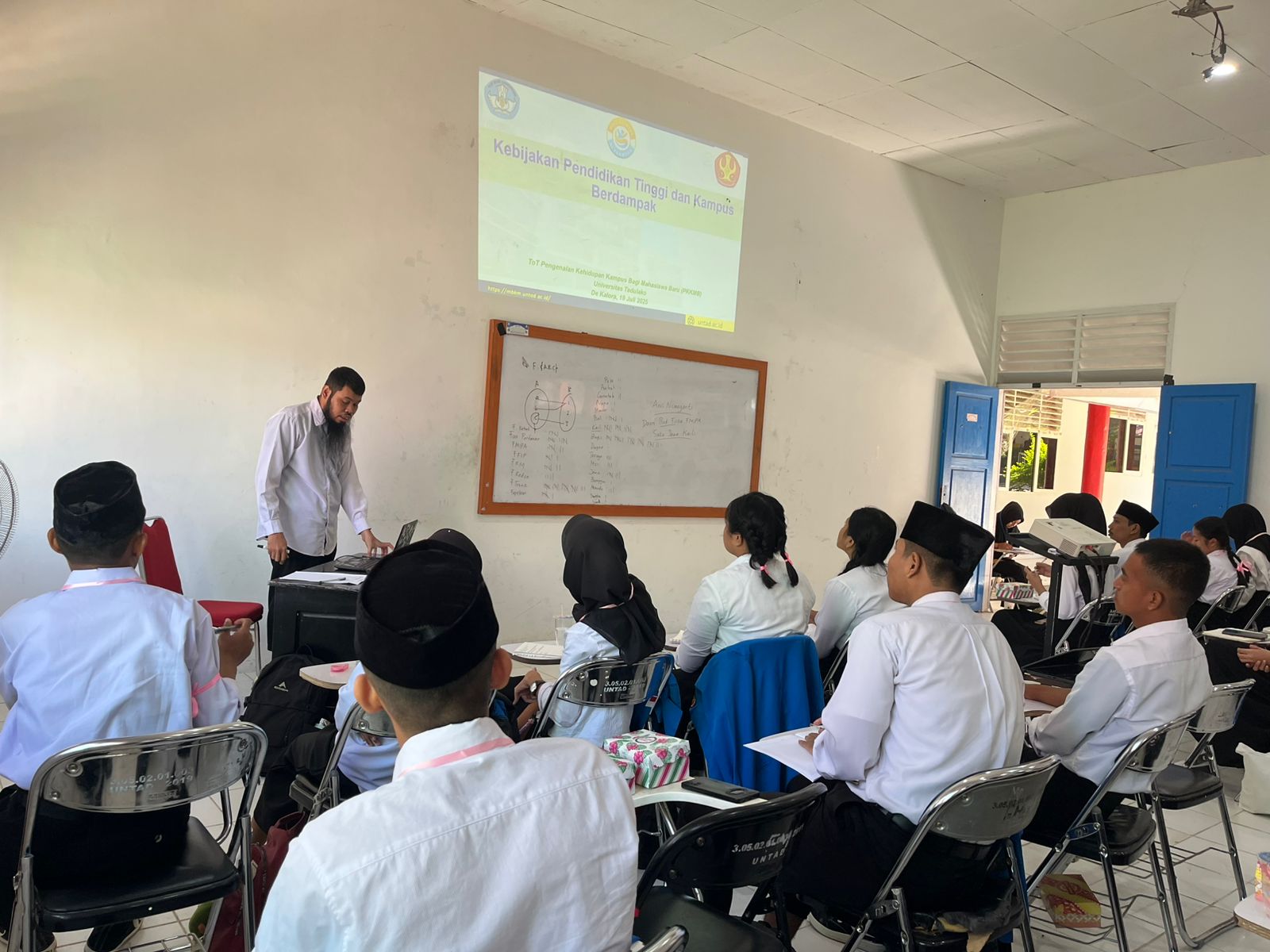 Palu, 28 Juli 2025 – Universitas Tadulako menyelenggarakan kegiatan Pengenalan Kehidupan Kampus bagi Mahasiswa Baru (PKKMB) Tahun 2025 yang diikuti oleh ribuan mahasiswa baru dari berbagai fakultas. Untuk memperlancar pelaksanaan, peserta PKKMB dibagi ke dalam beberapa kelas luring dan daring. Salah satunya adalah kelas di Ruangan MIPA 2 dan MIPA 4, yang diikuti oleh 150 mahasiswa baru dan mendapat kesempatan mengikuti materi dari dosen Universitas Tadulako.