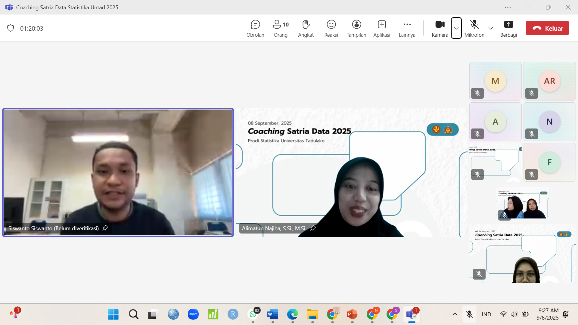 Palu, 8 September 2025 — Program Studi Statistika, Fakultas Matematika dan Ilmu Pengetahuan Alam (FMIPA) Universitas Tadulako menyelenggarakan Coaching Satria Data 2025 secara daring melalui Zoom Meeting. Kegiatan ini menjadi bagian dari upaya prodi dalam meningkatkan daya saing mahasiswa di tingkat nasional.